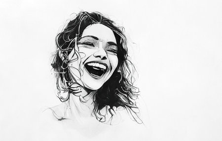 Black and white ink painting of a laughing girl