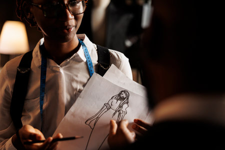 African american couturier showing tailoring studio workspace coworker sketch drawing design she made of haute couture dress. Dressmaker working on comissioned bespoke sartorial outfit