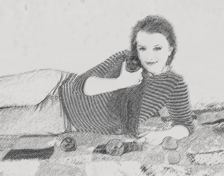 young woman lying down on the ground in park. Effect pencil