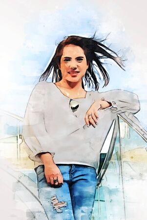 Abstract colorful happiness young woman smile portrait and walking traveling in the city on watercolor illustration painting background.