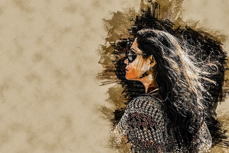 Beautiful watercolour portrait of a young woman with white colour background with copyspace. Indian handdrawn painting on paper.