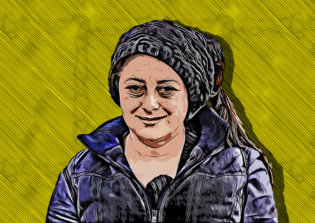 illustration of a beautiful smiling deep eyes mature woman, Caucasian but with Arabic or Middle Eastern features, holding her chin with hands