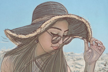 Girl in a hat and glasses on a background of blue sky.