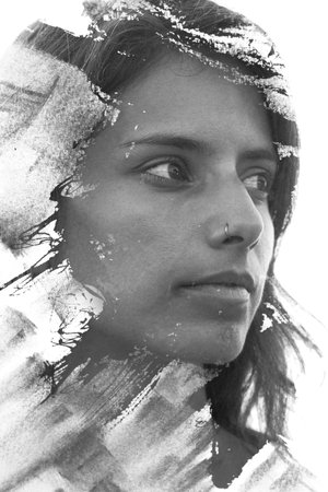 Paintography. Double exposure of woman's portrait dissolving into patterns and shapes, black and white