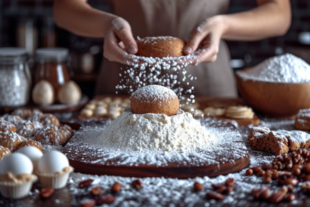 In a rustic bakeshop setting, this wide-angle shot captures the essence of artisanal baking with a variety of handcrafted pastries displayed amidst a cascade of flour dust. The image focuses on a beautifully piped cream pastry in the foreground, with a backdrop featuring an array of confectionery including puff pastries, croissants, and dusted sweet bread. The vintage culinary tools and traditional wooden surfaces add to the old-world charm of the scene. Perfect for use in culinary storytelling, this photograph evokes the sensory pleasures of a heritage bakery and would be a delightful addition to editorial content, cookbooks, and food-themed websites.