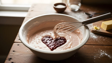 A white mixing bowl contains pink batter with a distinct heart shape formed from dark red jam. A metal whisk rests in the batter, and in the background, a block of butter and a small bowl of sugar are visible on a rustic wooden table dusted with flour. The image evokes a sense of homemade baking and culinary creativity.