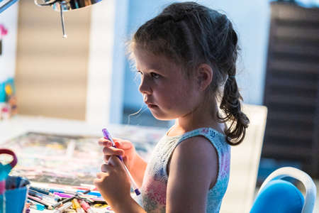 Indoor image of artistic little girl painting with oil pencils, sitting at white desk at home. Pretty smiling preschool kid drawing with pencils. People, childhood and education concept