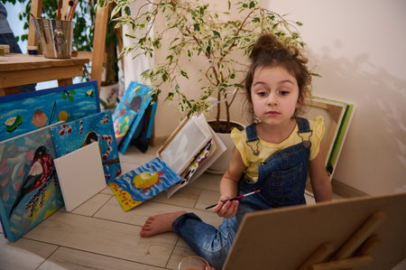 Beautiful Caucasian baby girl enjoying learning painting, sitting on the floor at a wooden easel against the background of colorful joyful children painted images. Art class, creativity and education