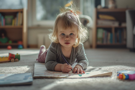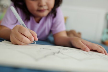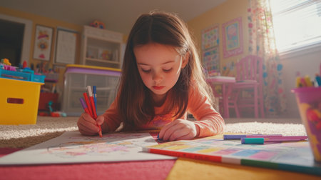 A young girl focusing on her coloring project, showcasing creativity and joy in a playful indoor setting. Perfect for educational and artistic themes.