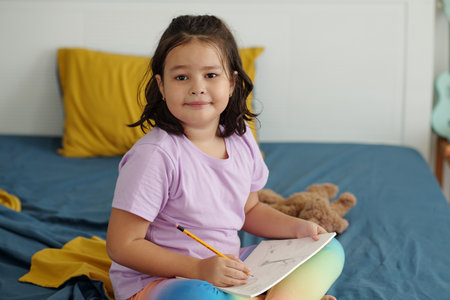 Cute little girl drawing colorful pictures with crayons at home, happy and creative activity.