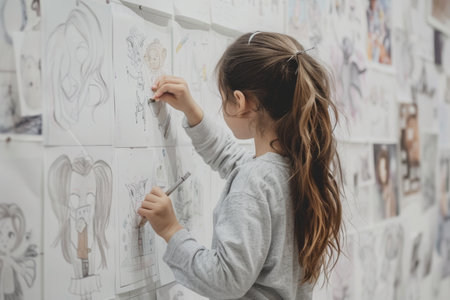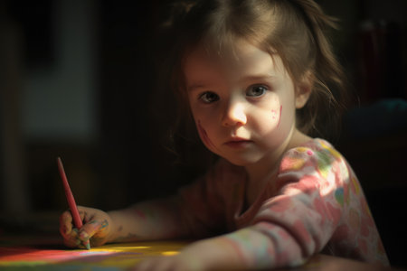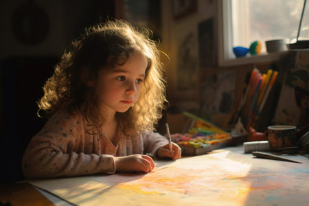 A young girl with a pencil in hand, looking thoughtfully at her work, possibly drawing or writing, with light illuminating her from behind. Ideal for themes of childhood creativity, learning, and artistic development.