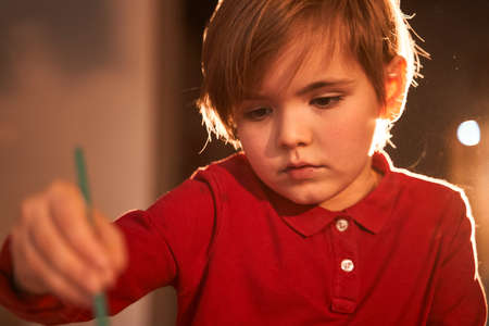 Little blond boy plays painting at home. entertainment during quarantine. family at home coronavirus.