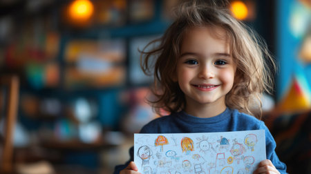 Portrait of a cheerful preschooler proudly showing her drawing at kindergarten