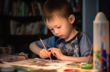Little artist Happy little boy relaxing while painting with watercolors sitting at the table : Generative AI
