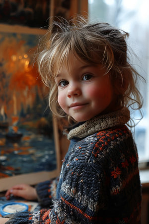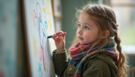 A charming young girl, dressed warmly in a cozy jacket and a vibrant scarf, is focused on drawing on a canvas. Her expression radiates creativity and joy as she brings her colorful imagination to life with each stroke.