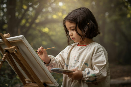 A young girl in a white dress engages deeply with her canvas, painting in a tranquil forest as sunlight filters through the trees.