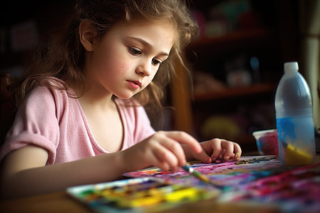 Keen little girl painting with watercolors, focus on paints. Low angle.