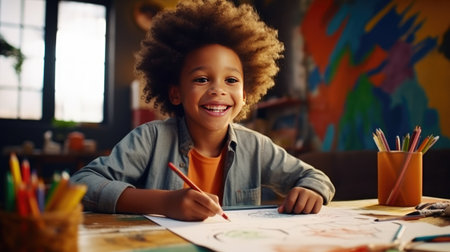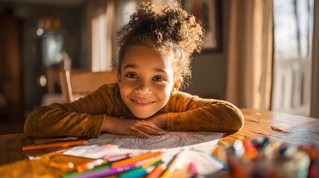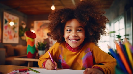 Colorful childhood, young African-American girl draws passionately at home with colored pencils.