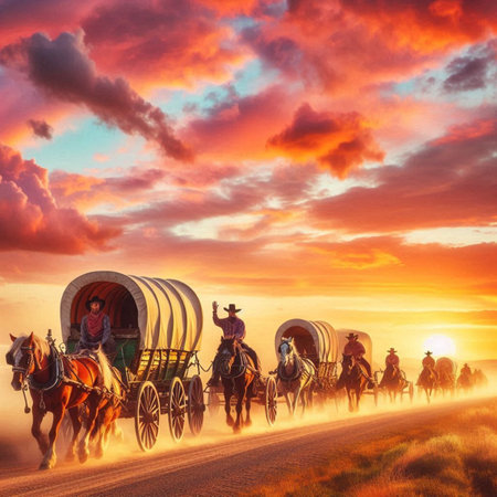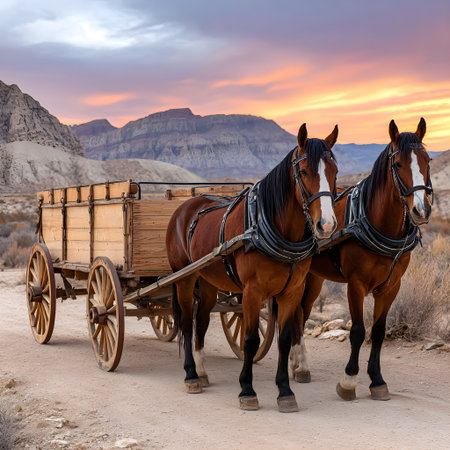Pair of horses pulling an old west style wooden wagon along a desert dirt road at sunset