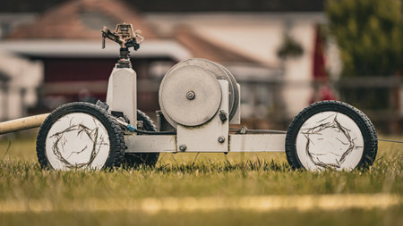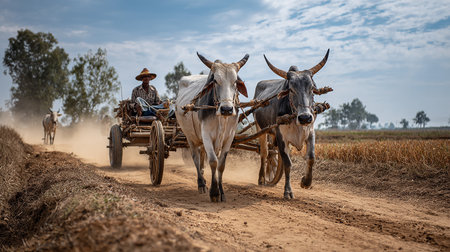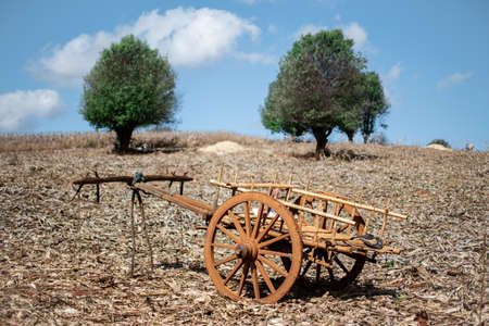 A beautiful old wooden wagon with two wheels on a rural farm field between Kalaw and Inle Lake, shan state, Myanmar