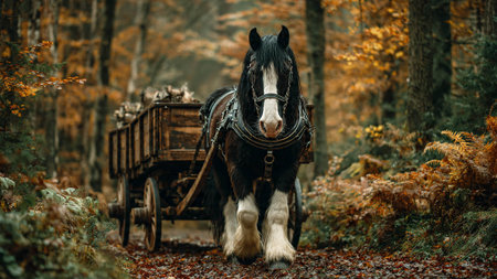 A majestic black horse pulls a wooden cart through a vibrant autumn forest