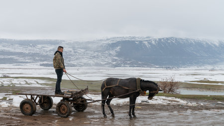 Bitlis, Turkey - February 2020: Man riding a cart with horse in Eastern Anatolia snowy landscape