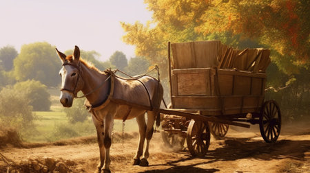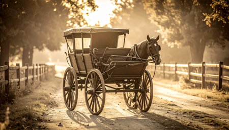 A lone horse-drawn buggy waits on a quiet country road as the golden morning sun cuts through the early mist. The scene evokes a sense of nostalgia and a journey back to a simpler, more peaceful time, filled with the quiet charm of a bygone era.