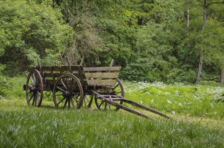The wooden wheel of a cart standing in the grass. An old horse-drawn carriage. An old abandoned unnecessary cart.