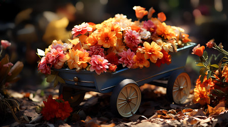 Flowers in a cart on a background of autumn leaves. Selective focus.