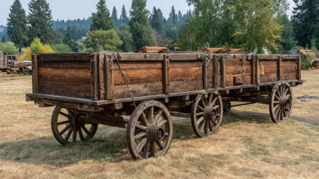 An aged wooden wagon stands on a grassy field, under daylight. The wagon showcases a weathered texture, and is composed of wood with iron wheels. A forest of trees serves as the backdrop, suggesting an outdoor environment. This image could be used for historical, educational, or commercial projects.