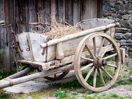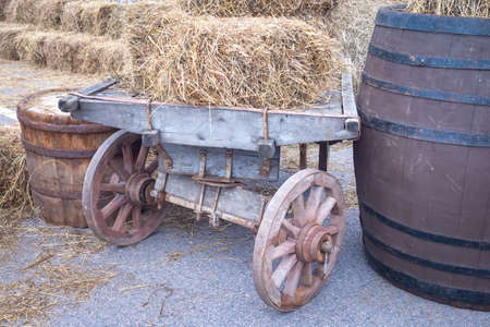 An old hay cart and barrels. The interior of the farm. Old agricultural supplies. Harvesting hay in ancient times.