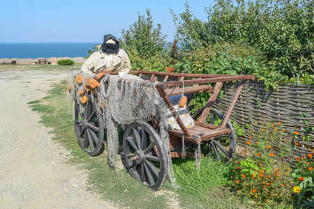 Mannequin fisherman in the wagon. The wagon with fishing nets and fisherman doll with a beard.