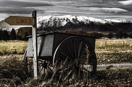 Old wooden wagon standing in dry grass field with mountains and cloudy sky in the background
