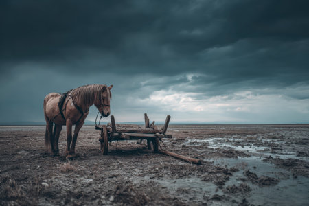 A solitary steed stands beside a forsaken wagon amidst barren plains, under ominous clouds signaling an approaching tempest.