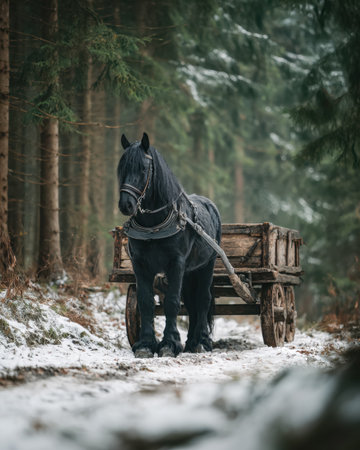 A majestic dark horse guides a vintage wooden wagon through a snow-covered forest path, evoking tranquility and rustic charm in winter's embrace.