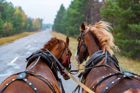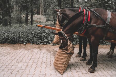 Two beautiful horses in a cart eat from bags, stand on the road among the forest