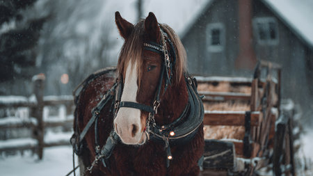 A beautiful draft horse, adorned with a harness, stands patiently in a gentle winter snowfall. The rustic scene evokes a sense of tradition and the quiet beauty of a snowy countryside.