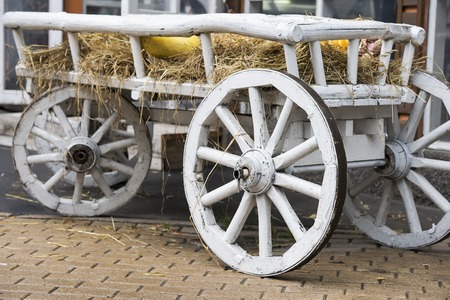 An old wooden cart with big wheels stands on the road in the village on an autumn sunny day. Harvest wagon and agriculture. The peasantry. Historical transport.