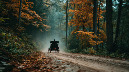 A vintage car travels down a dirt road surrounded by vibrant autumn foliage, capturing a serene and nostalgic scene in a tranquil forest setting.