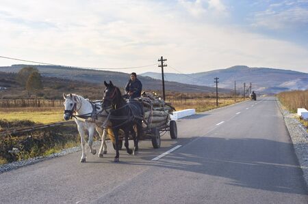 Hateg, Romania - October 25, 2011: Man driving horse cart by the country road. Horse cart on Romanian roads are a kind of landmark.