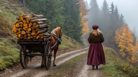 Young Woman Walking with Horse-Drawn Cart Loaded with Firewood on a Misty Autumnal Forest Road