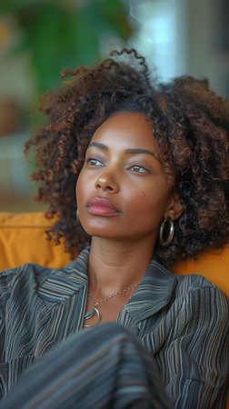 A woman with curly hair is wearing a yellow jacket and standing on a rooftop. Concept of confidence and style, as the woman poses for the camera with her head tilted