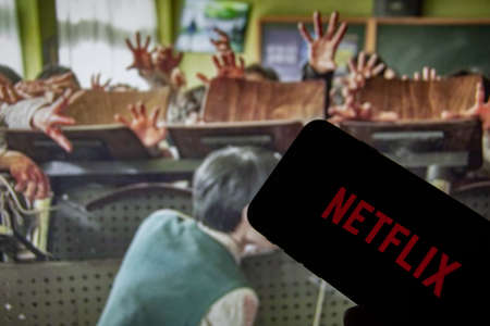 Rheinbach, Germany 2 February 2022, The Netflix logo on the display of a smartphone in front of a television with the new series All of Us Are Dead ( focus on Netflix logo )