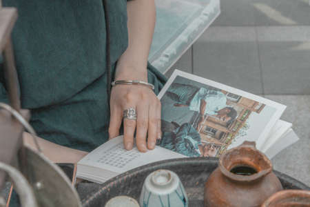 PARIS, FRANCE - OCT 4, 2018: Woman unboxing new book against green background The Subtle art of not giving a fuck by Mark Manson