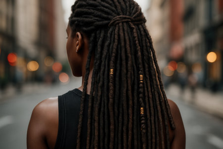 Back View Urban Portrait With Long Dreadlocks And Gold Hair Cuffs