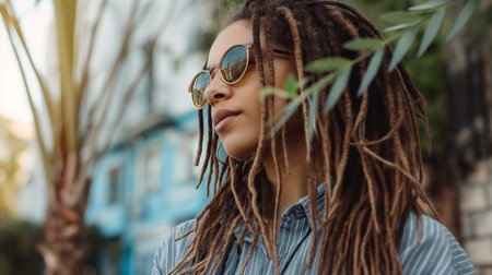 Portrait of a cheerful woman with dreadlocks and sunglasses. Generative AI