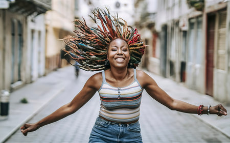 Energetic cool African woman with colorful dreadlocks dancing on the street. Generative AI.
