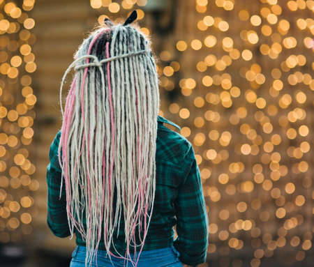 Youn extraordinary woman with dreadlocks hairstyle and plaid shirt posing back view against the background of garlands