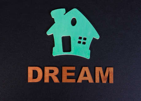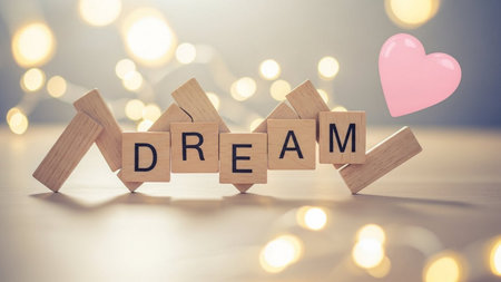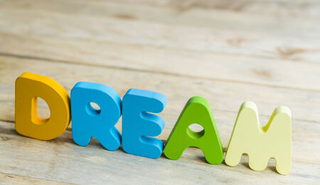 still life of DREAMS sign concept made of wooden blocks on a green grass under bright blue sky