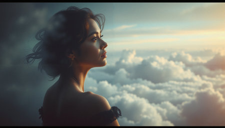 The image depicts a woman gazing upwards at the sky, her dark hair blowing gently in the breeze as she stands against a backdrop of fluffy white clouds that stretch out towards a brilliant blue horizon. The sun casts a warm glow over the scene, illuminating the womans face and shoulders, while her black dress with lace trim adds a touch of elegance to her overall appearance. In the background, the sky transitions from light blue at the top to a soft yellow hue near the horizon, creating a sense of depth and atmosphere. The overall effect is one of serenity and contemplation, inviting the viewer to pause and appreciate the beauty of the natural world.